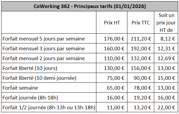 Les autres formules (sauf CoWorking à la demi-journée) permettent un accès plus tôt ou plus tard que les horaires indiqués, sans supplément, sur simple demande par mail (sauf sur les soirées privatisées).